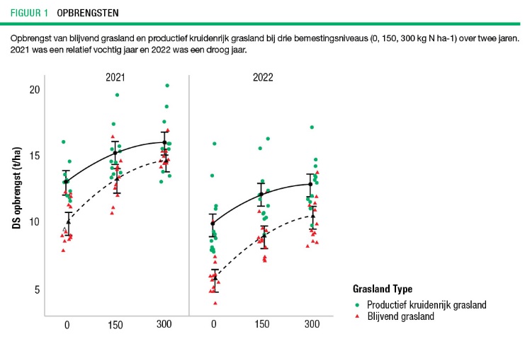 Productief kruidenrijk grasland kan met de helft aan stikstof, evenveel of zelfs meer droge stof en stikstof leveren als intensief bemest blijvend grasland. Daarnaast blijkt het minder gevoelig voor opbrengstschommelingen tussen drogere en nattere jaren. Extensief kruidenrijk grasland levert de hoogste diversiteit aan plantensoorten, maar het minste – en minst voedzame – ruwvoer.