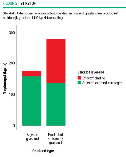 Bij een bemesting van 0 kg N per hectare was de natuurlijke stikstofbinding van productief kruidenrijk grasland via de klavers ongeveer 150 kg N per hectare (figuur 2). Tegelijkertijd was het stikstof leverend vermogen van bodem voor beide graslandtypes vergelijkbaar.