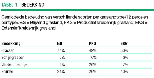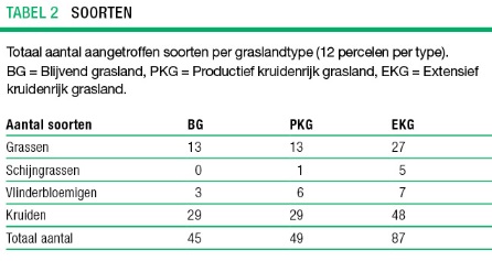 Extensief kruidenrijk grasland nam een bijzondere positie in. Het grasland was rijker aan soorten dan in de landbouwpercelen. Productief kruidenrijk grasland had meer soorten dan blijvend grasland, maar haalde op dat punt niet de niveaus van extensief kruidenrijk grasland (tabel 2).
